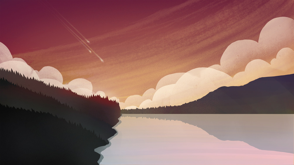 A summer evening sunset over a lake as shooting stars fall to earth.